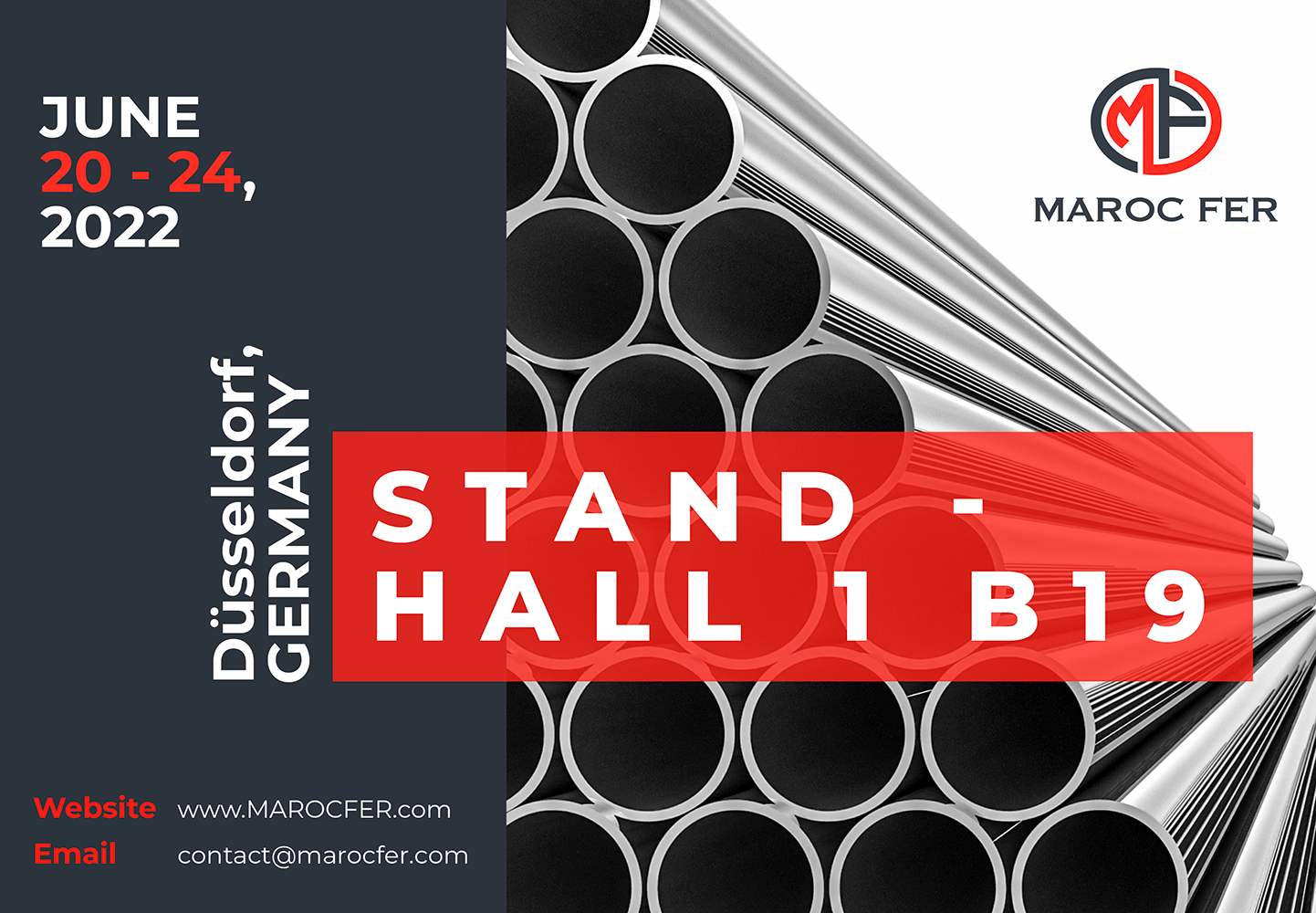 We have the great pleasure to inform you that Maroc Fer, will participate from June 20 to 24, 2022 to Tubes 2022 Trade Fair at Messe Düsseldorf in Germany.
